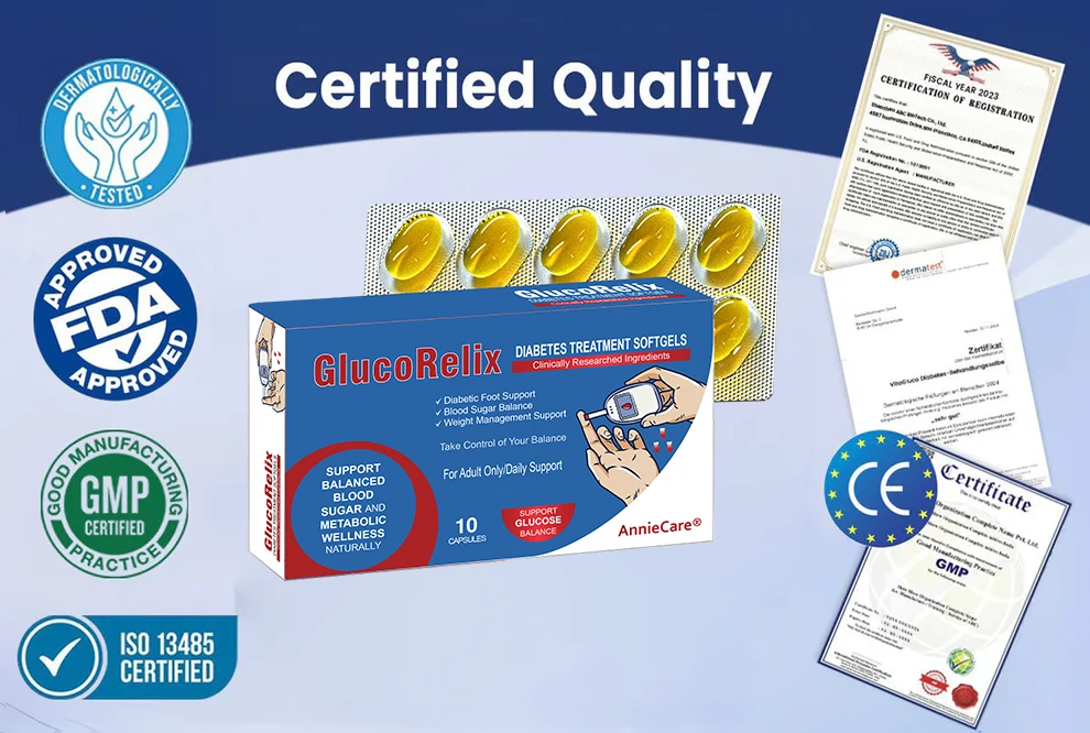 Diabetic foot care is crucial, yet truly effective management starts beneath the skin. AnnieCare® GlucoRelix Softgels provide foundational support from within, specifically designed to promote healthy blood flow and aid the body's natural recovery process. This internal action is key to helping soothe skin, reduce dryness, and fortify your feet's natural defenses. By addressing the root cause, our formula offers a proactive approach to maintaining foot health and supporting overall wellness as part of your daily routine.