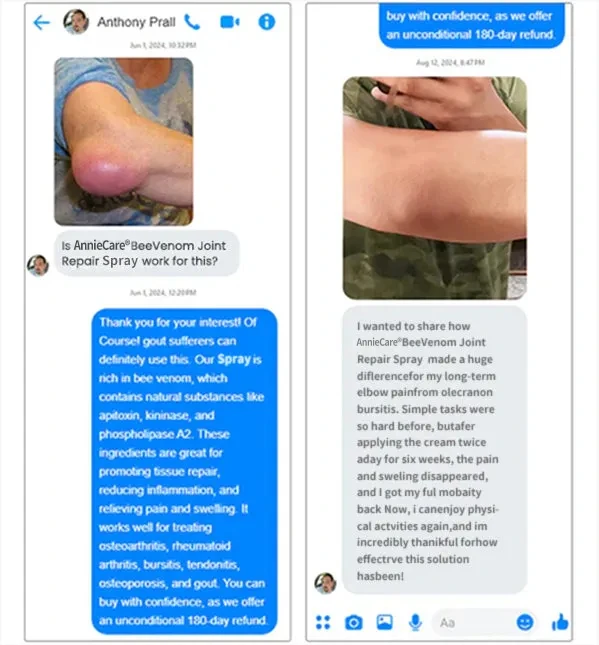 "As a leading orthopedic data scientist. I wholeheartedly recommend AnnieCare® Bee Venom Bone & Joint Revive Spray for individuals suffering from arthritis. osteoarthritis. and chronic joint inflammation. The meticulously chosen active ingredients. including purified bee venom filtrate. glucosamine. and chondroitin. work in powerful synergy to reduce pain. restore lost mobility. and actively support cartilage and bone repair. My patients who have incorporated this advanced spray into their pain management routine have consistently reported remarkable and lasting improvements in just a few weeks." Dr. Michael C.