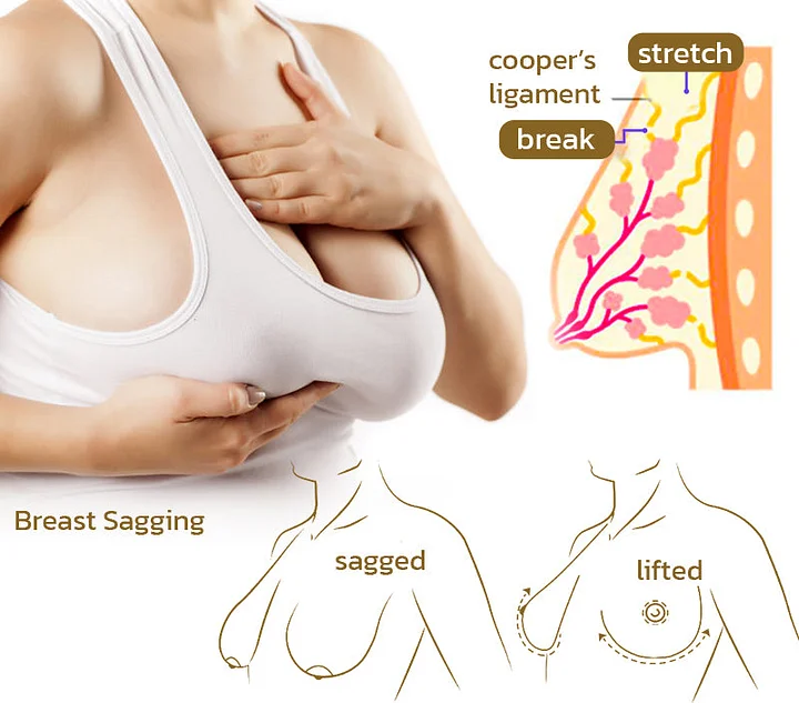 As women age. go through pregnancy and childbirth. experience hormonal fluctuations. and accumulate toxins over time. collagen production slows and estrogen levels drop. This weakens the skin and breast-support structures. causing the breasts to lose fullness and firmness. while the skin becomes looser.